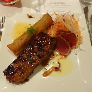 写真は前菜です。春巻きなどなじみのある味もありますが、シーフードはハワイならではの新鮮さで、とても美味しかったです。
