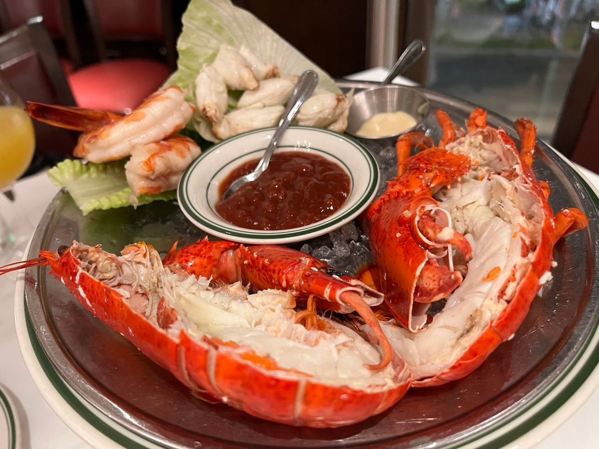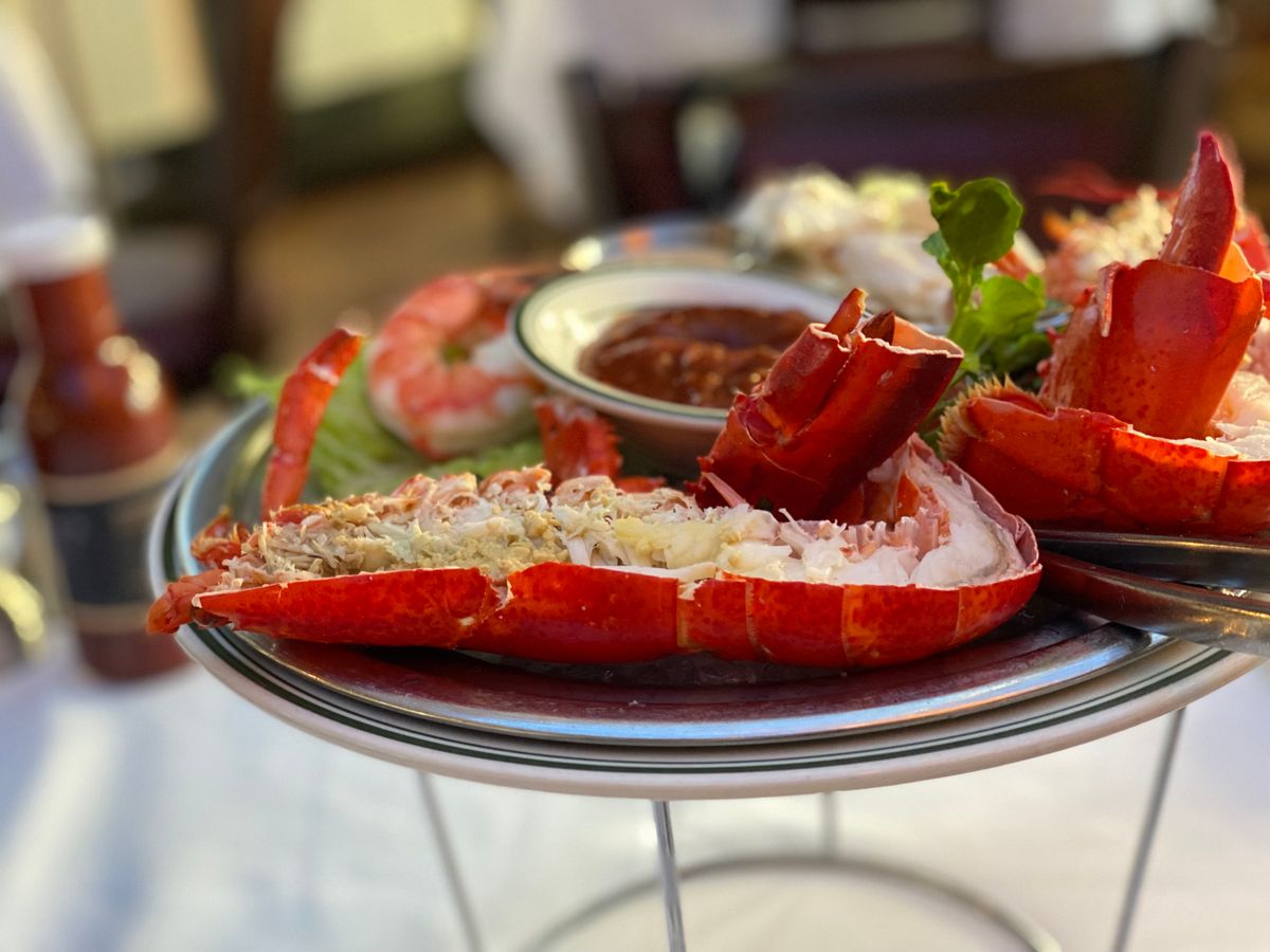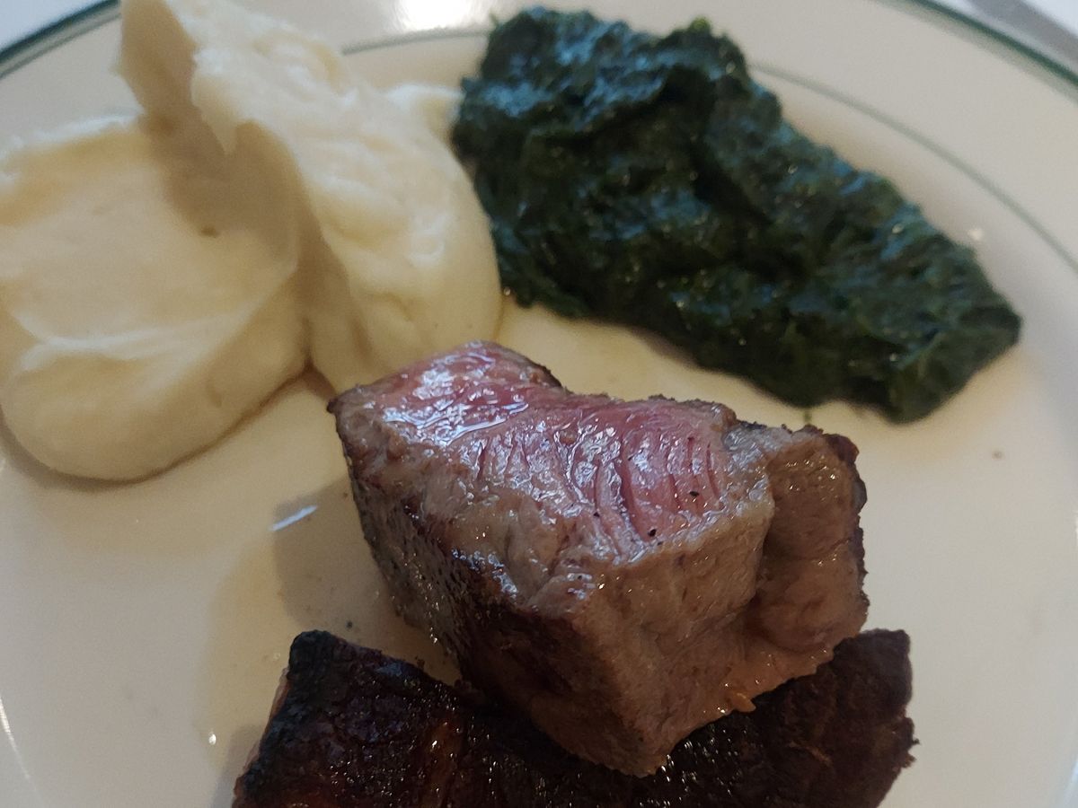 ロブスターやTボーンステーキ&マッシュポテトとほうれん草ペーストの付け合わせは噂通りのおいしさで、紹介されたライトな赤ワイン(別料金)との
