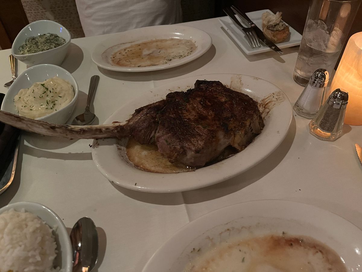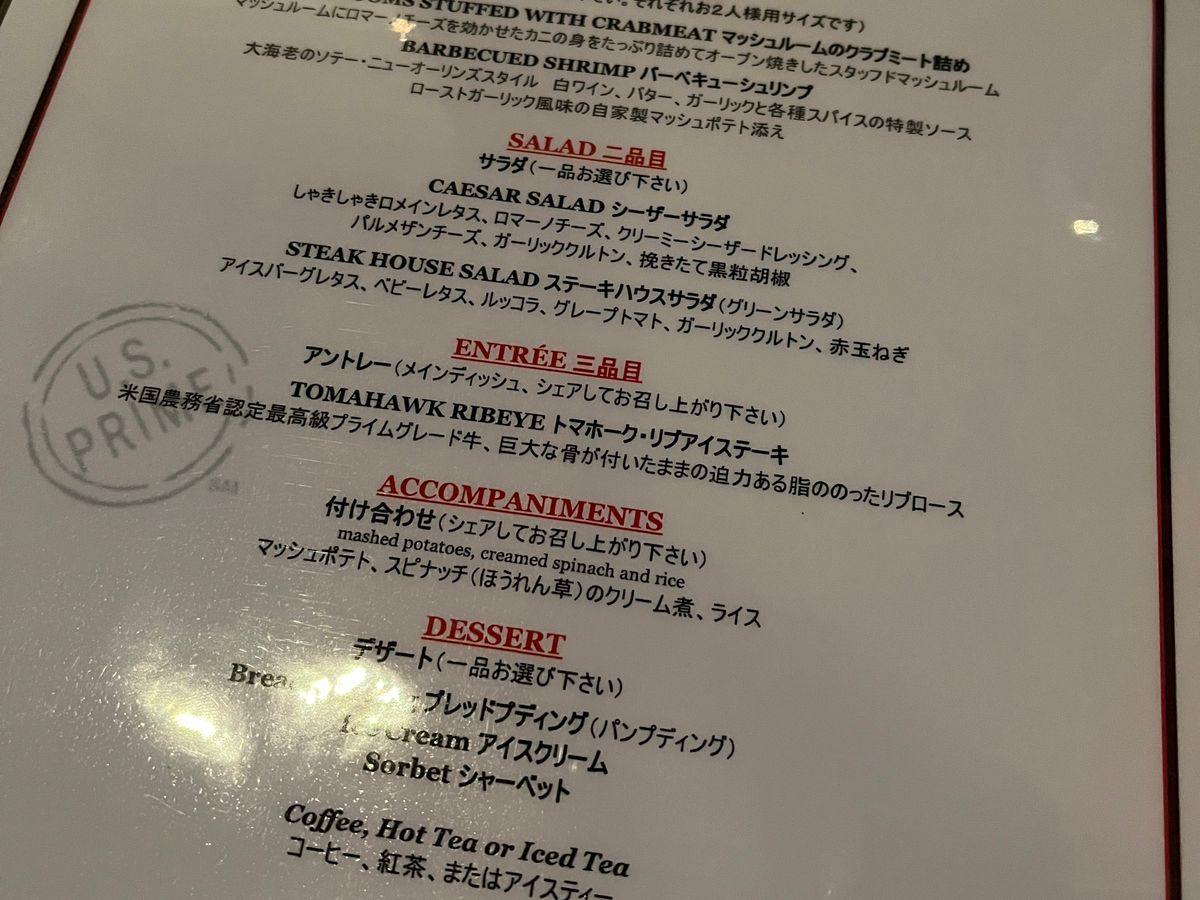 まず、店内の雰囲気は非常に高級感があり、落ち着いた雰囲気が広がっています。スタッフの方々もとてもフレンドリーで、心地よいサービスを提供してくれました。メニューは多彩で、様々な種類のステーキが楽しめます。私たちはウェイターのおすすめでポーターハウスステーキを注文しました。