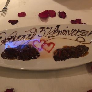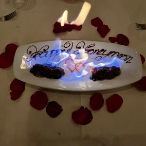 赤身っぽい肉で、つけて食べるバターが肉と合って、すごく美味しかったです。ハネムーンと伝えるとサプライズでデザートの演出をしてくれました。