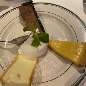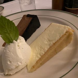 デザートの盛り合わせは、濃厚なニューヨークチーズケーキとチョコレートムースのケーキ、たっぷりの生クリーム添えでした。