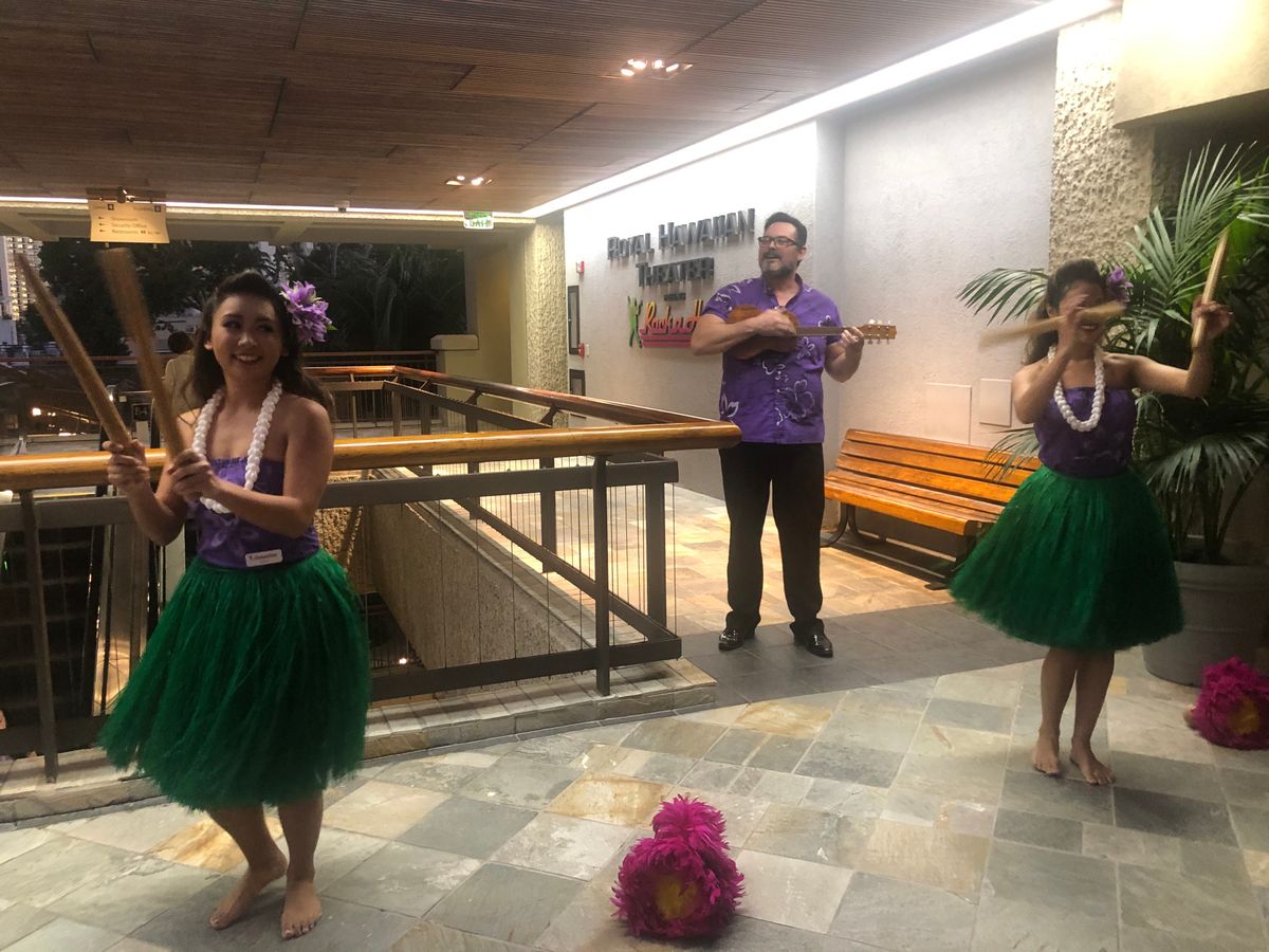 ウェイティングルームに入る前に並んでいると、フラと歌で飽きさせません。時間になるとワンドリンクのマイタイを(ノンアルコールとアルコール)も選び、おつまみを頂きます。スター達のポスターや小物が飾ってあり写真撮影も、ここから盛り上がってきます(笑)