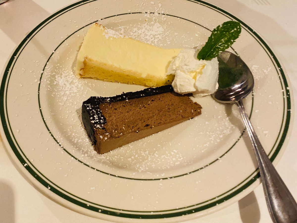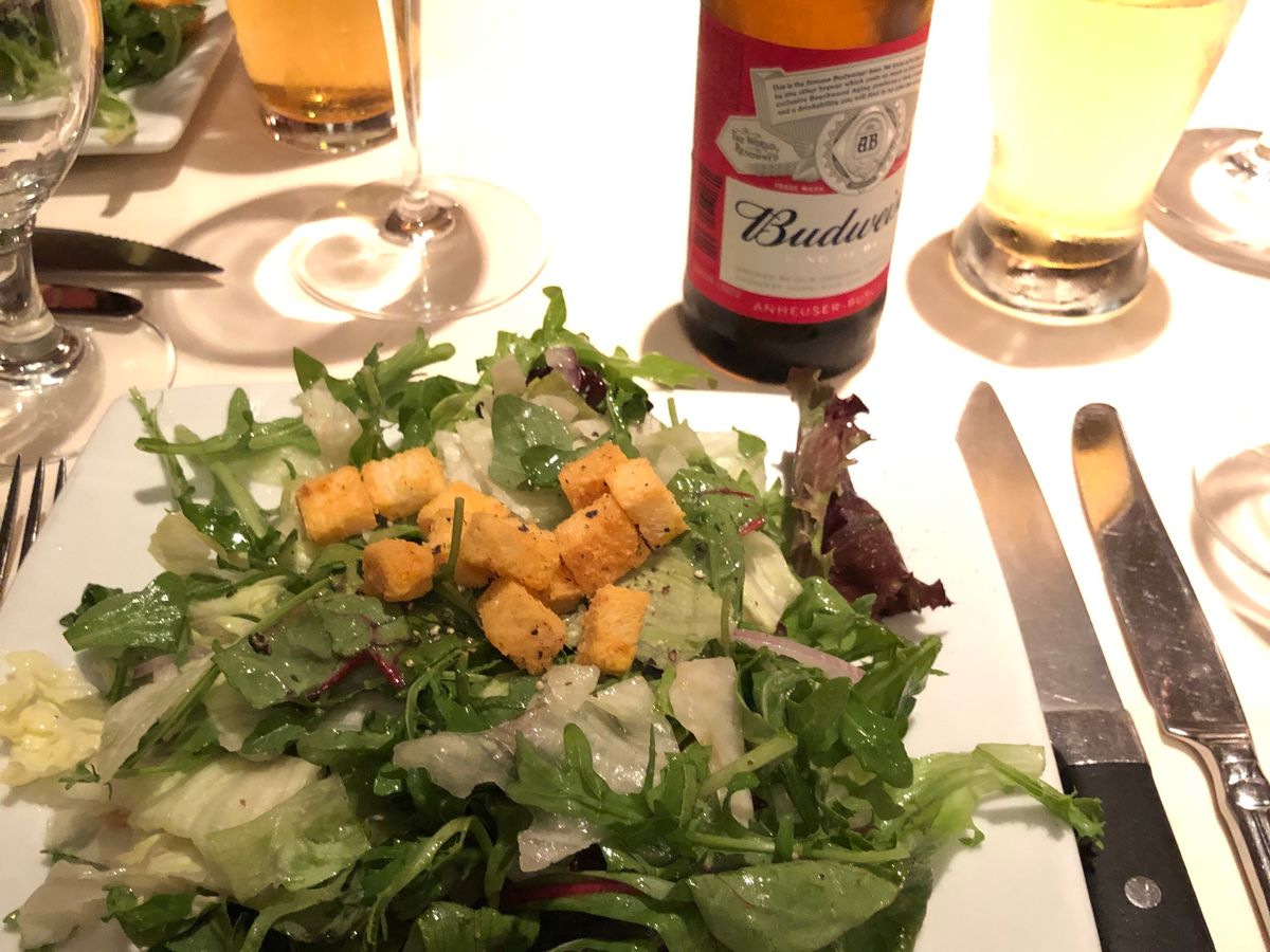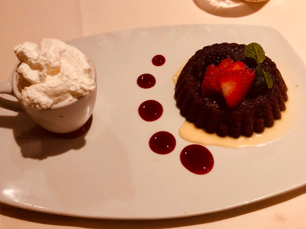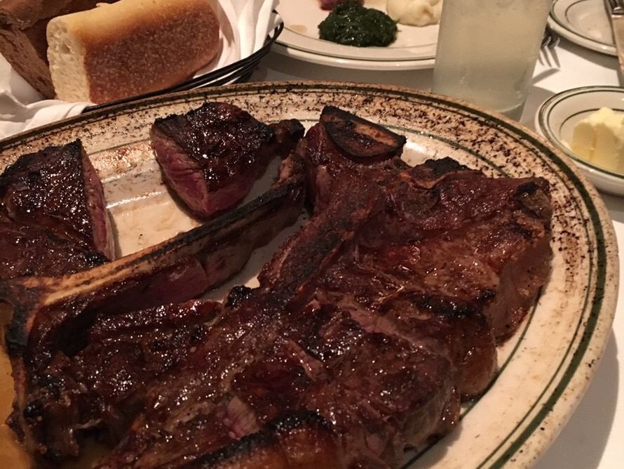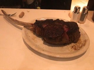 最初はビールで、シーフード盛りを。エビをガッツリ食べました。その後、メインのステーキを。Tボーンで、フィレが少しと残りはサーロインでした。ほんとに凄い肉汁で、お腹いっぱいになりました。ハーフワインがあったので、2人で分けて丁度良い夜量で飲むこともできました。デザートはコーヒーとともに、チョコレートケーキが美味しかったです。