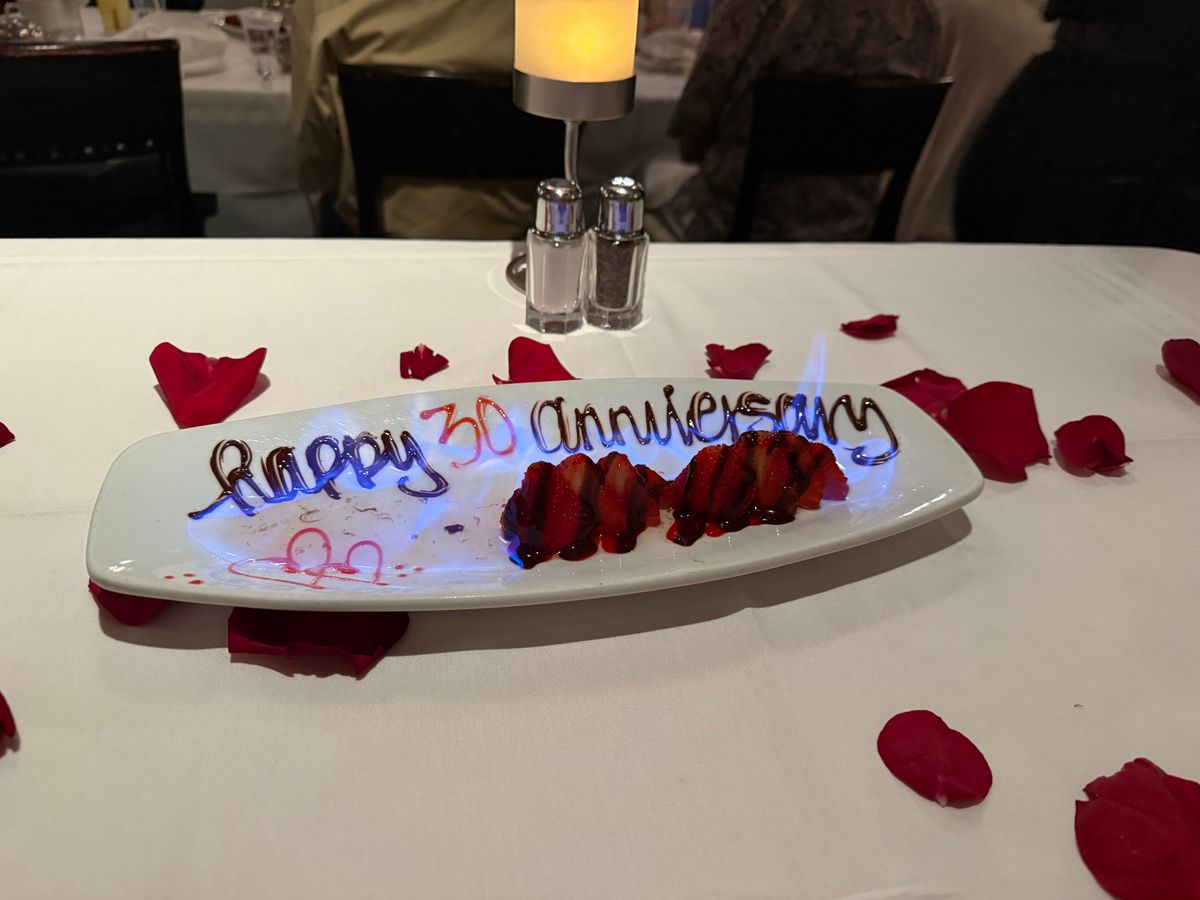 最後に30周年記念と書かれたお皿にイチゴとチョコにブランデーをかけてフランベしたデザートを持ってきていただき感激しました。ありがとうございます。