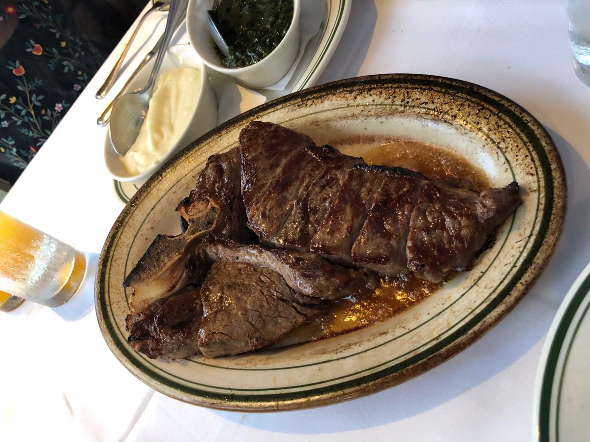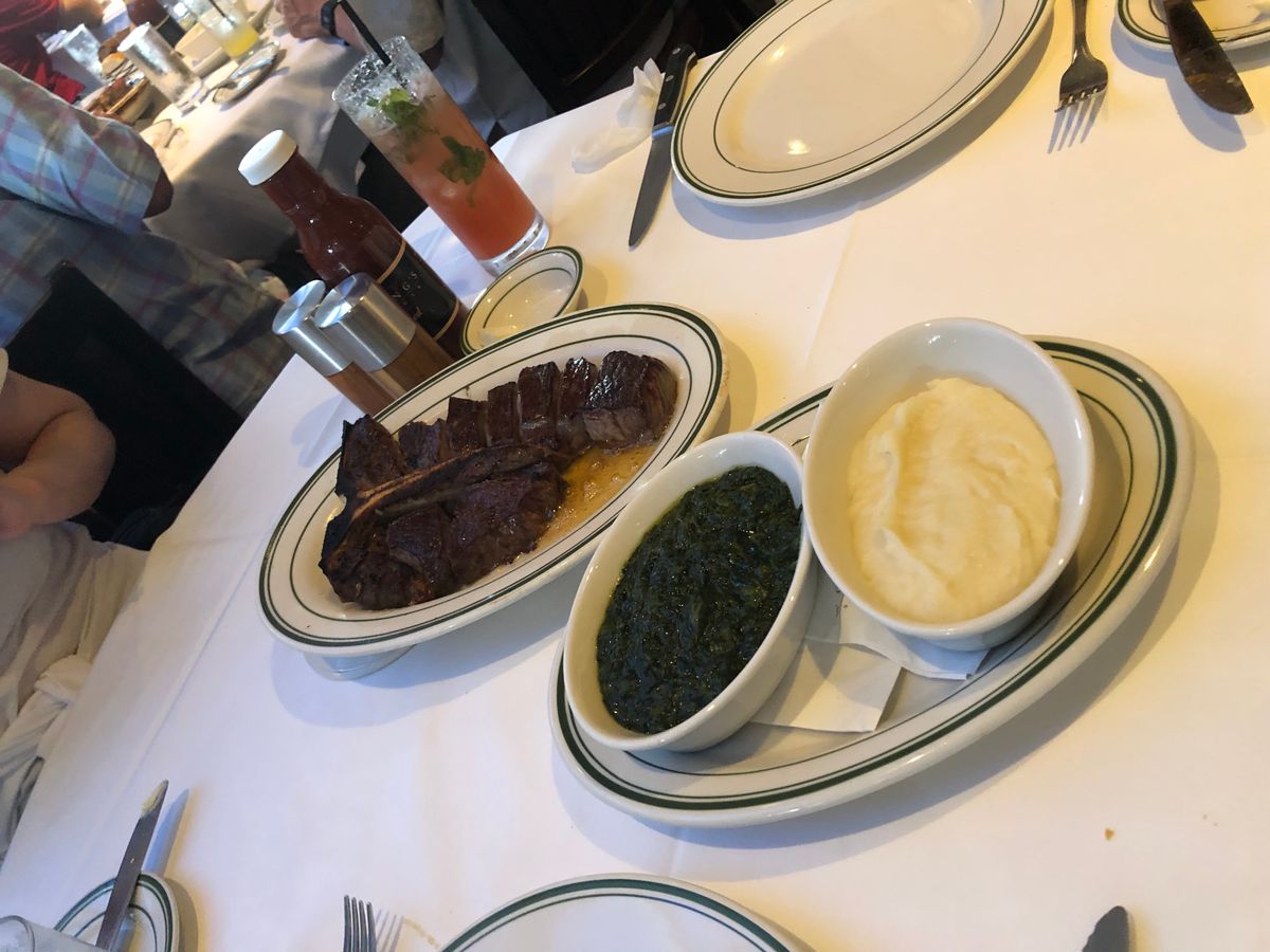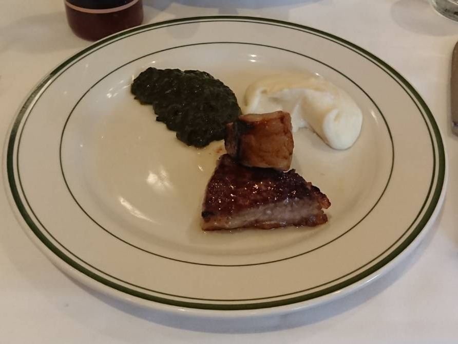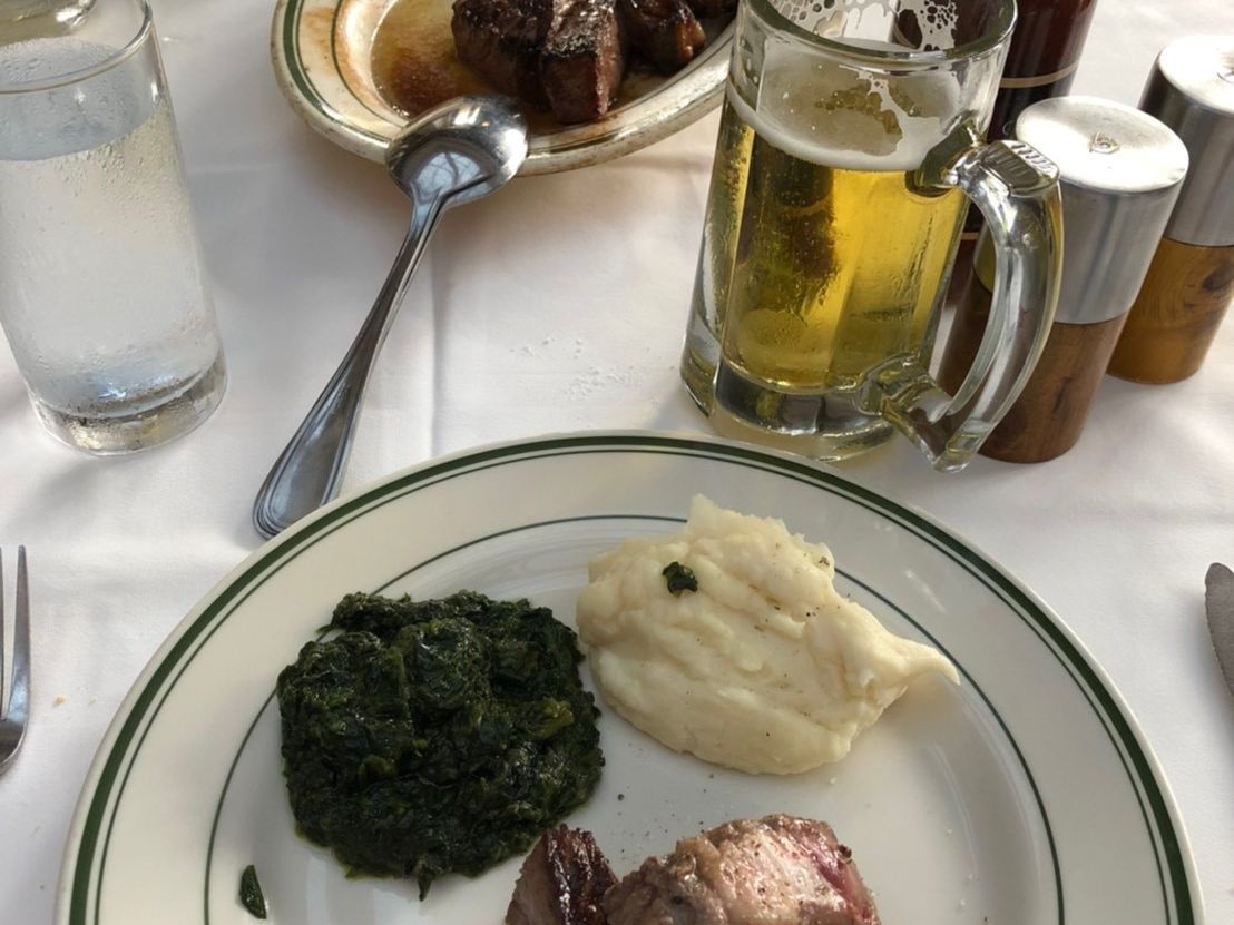 このTボーンステーキが食べたくて予約をしました。日本ではなかなか予約が取れないので奮発です(笑)。高級店の雰囲気ですが、意外にラフな格好をしたお客さんもいました。2人で違う焼き加減でお願いしましたが、オーダー通り、それぞれに取り分けてくれます。前菜のシーフードプレートだけでもテンションが上がりまくりなのに、この大きくてやわらかいステーキの登場!そして付け合わせのポテトとほうれんそうがまたでかい!そして美味しい!おしゃれにワインでも、と思っていましたがまぁビールが進むこと。結局アルコールはビール一択で終了。デザートもしっとりたっぷりで大満足。大食いの私たち、コースの写真を見て「足りないかな?」と話していたのですがとんでもない、お腹いっぱいになりました。ウェイターさんがとても気さくで、変顔で一緒に写真を撮ってくれました(笑)。ものすごい人数のウェイターさんがフロアをうろうろ、お客さんの食事の進行具合を見守っていて、高級店は違うなと思いました。