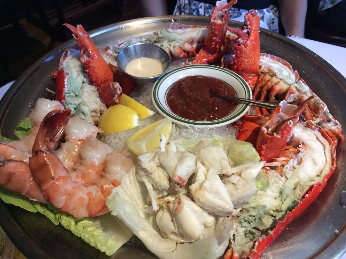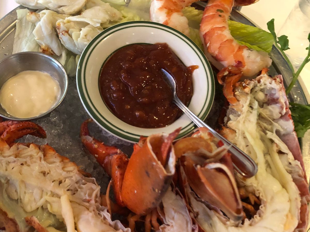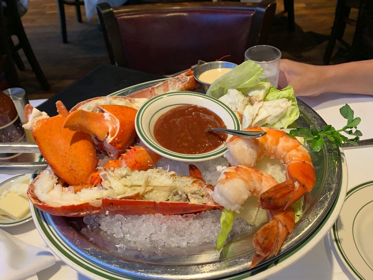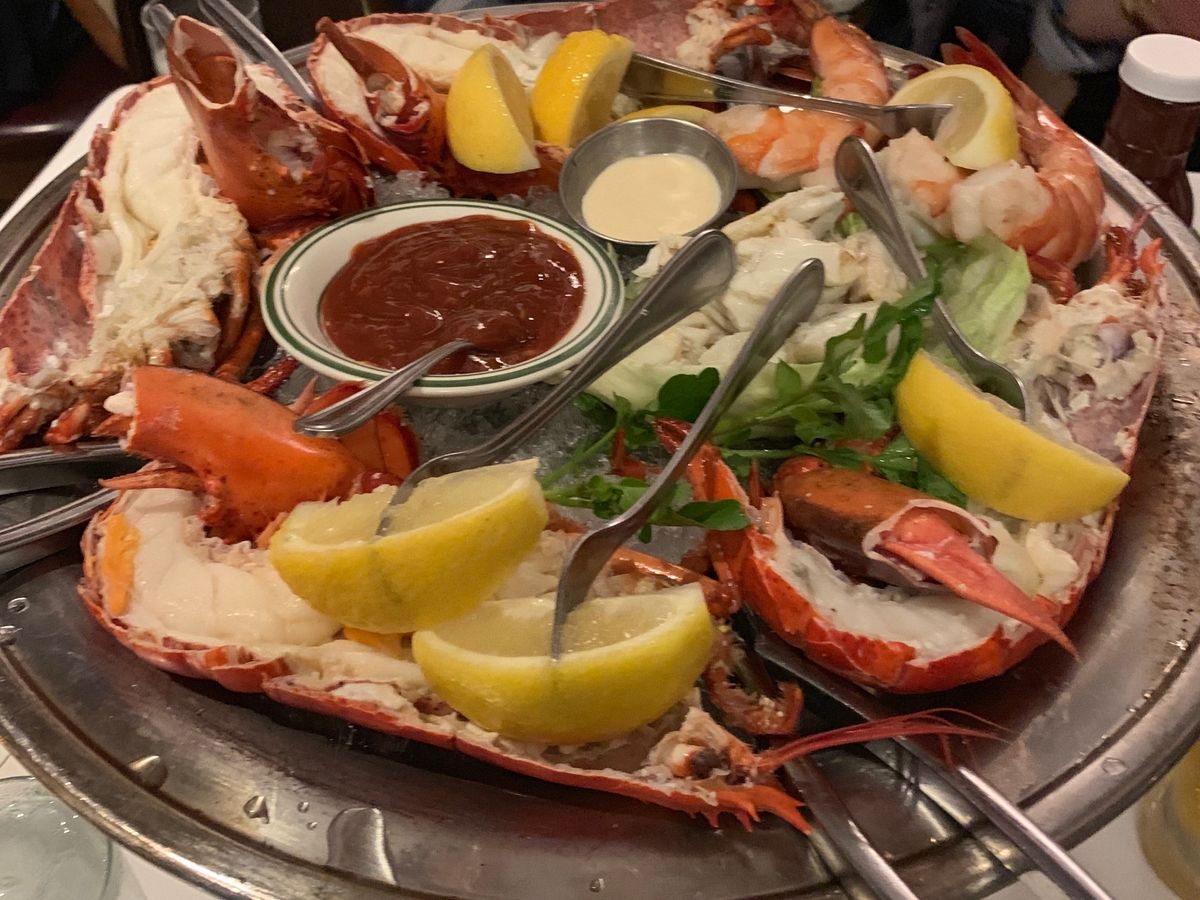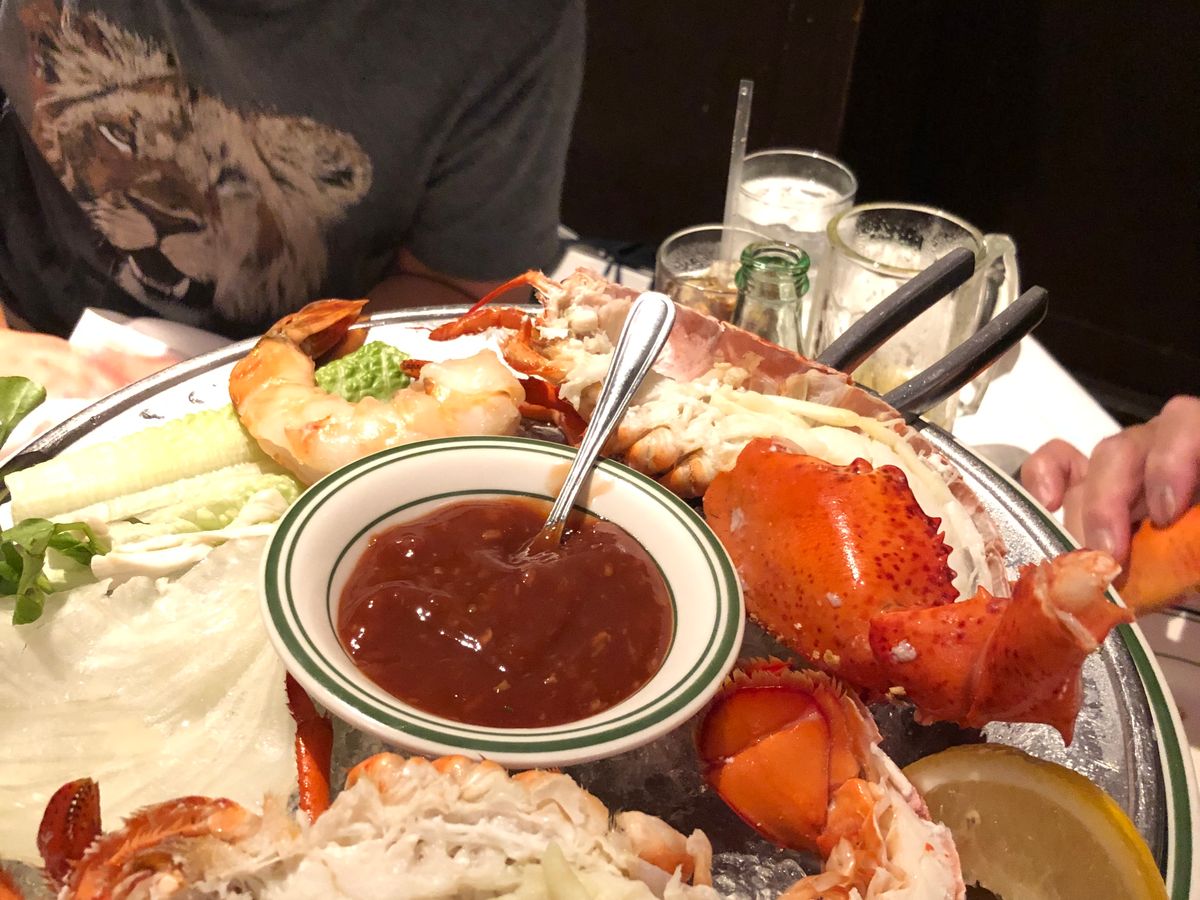 来店してみると既に沢山のお客さんがいました。手前のフロアは満席に近い状態だったので奥のフロアに案内されました。まだ2、3組の客数でしたが私達の後に続々と来店しあっという間に奥のフロアも満席に‼︎やっぱり人気のお店なんだ‼︎と興奮しながらビールを飲みました。前菜のシーフードプレートはロブスターにエビ、カニとプリプリでジューシー‼︎もっと簡素なものかと思っていたのでボリュームもあり美味しかった!
