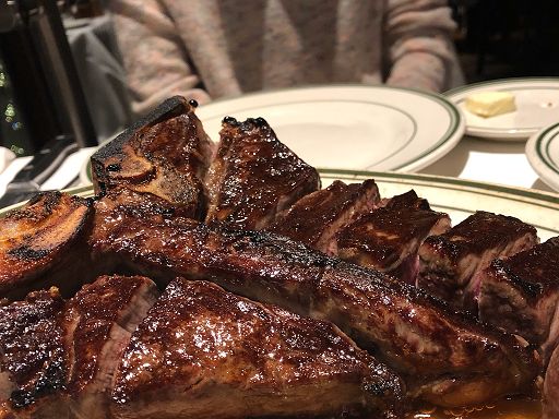 定刻にコールされてお店に入るととても落ち着いた雰囲気で、上品なウェイターさんが注文を確認してくださり食事が始まりました。パン、お皿一杯のサラダに続いて、骨つきの大きなトマホークステーキが2つ、ミディアムでお願いしたのですが、ウェルダンに近いものとレアに近いものの2種類の焼き加減でした。お肉の味は最高で、お腹いっぱいになります。家族4人で食べきれず少し持ち帰りました。食事時間は2時間、帰りはアラモアナのホテルまで腹ごなしに歩いて帰って来ました。