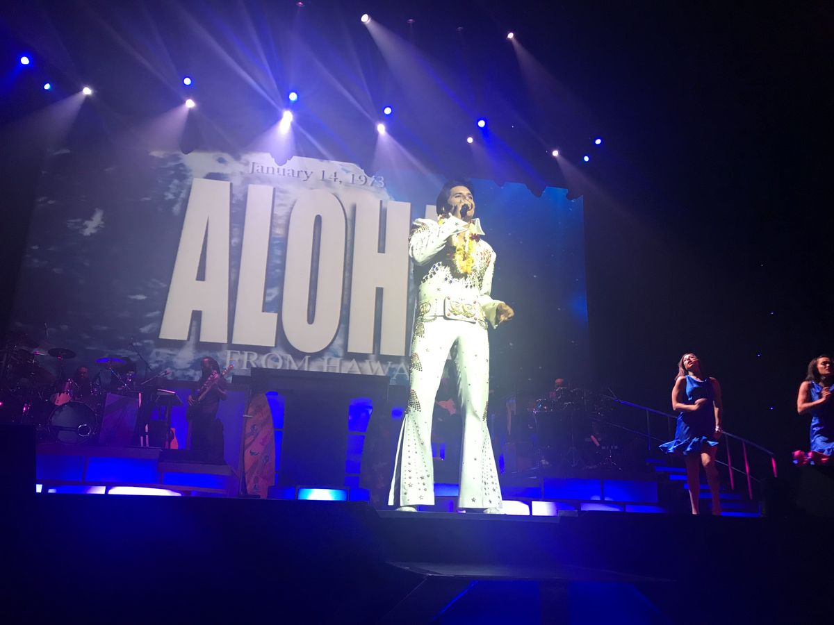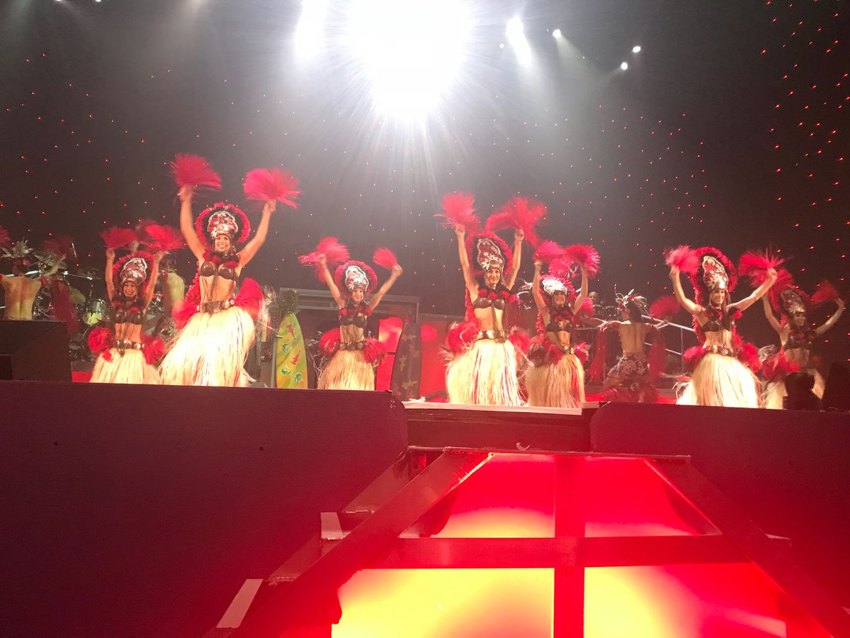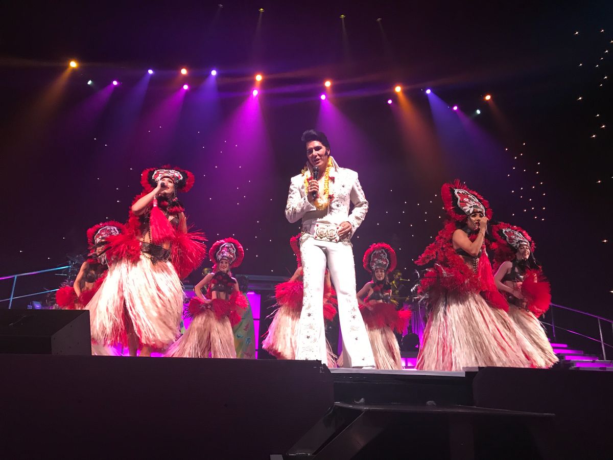 シャンパンとおつまみを貰って少しすると マネージャーが来てバックステージ見学です。説明は英語で 完全にはわかりませんが 十分に楽しむ事が出来ました。 エルビスの白いキラキラの衣装は重たいから持ってごらんと持たせてくれたし これがマイケルのビリージーンの衣装だよとか ダンサーが頭に付ける羽飾りを被らせてくれて写真を撮ってくれたりしました。バックステージを見学した事で 実際ステージが始まると マイケルやエルビスがあの衣装を着てる‼︎あのダンサーの羽飾り 私達が被ったものだ!なんて思う楽しみもあって よりショーを満喫することができました!席は1番前の席で大迫力です!エルビスは2階席にも1階席にもまわってきてくれました。私もレイを首からかけてもらい頬にキスしてもらいました。嬉しかった‼︎