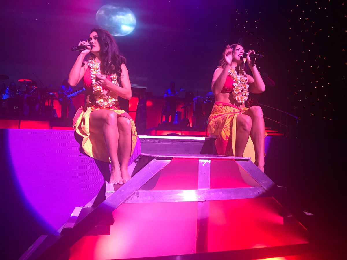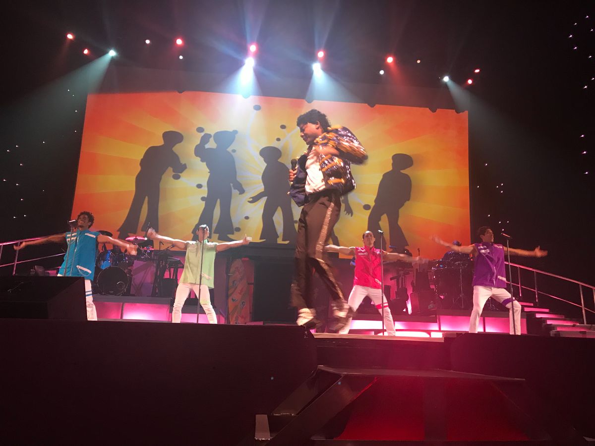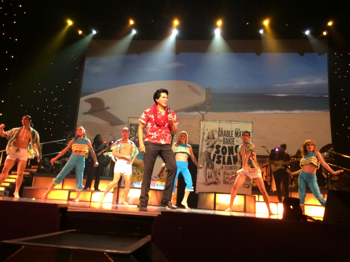 シャンパンとおつまみを貰って少しすると マネージャーが来てバックステージ見学です。説明は英語で 完全にはわかりませんが 十分に楽しむ事が出来ました。 エルビスの白いキラキラの衣装は重たいから持ってごらんと持たせてくれたし これがマイケルのビリージーンの衣装だよとか ダンサーが頭に付ける羽飾りを被らせてくれて写真を撮ってくれたりしました。バックステージを見学した事で 実際ステージが始まると マイケルやエルビスがあの衣装を着てる‼︎あのダンサーの羽飾り 私達が被ったものだ!なんて思う楽しみもあって よりショーを満喫することができました!席は1番前の席で大迫力です!エルビスは2階席にも1階席にもまわってきてくれました。私もレイを首からかけてもらい頬にキスしてもらいました。嬉しかった‼︎