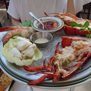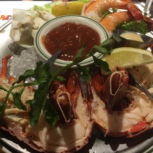 最初にポテトチップスが出てきて、次にオマール海老が入ったシーフード盛り合わせ、お肉もいいぐらいの量でした!付け合わせ共にとても美味しかったです♪