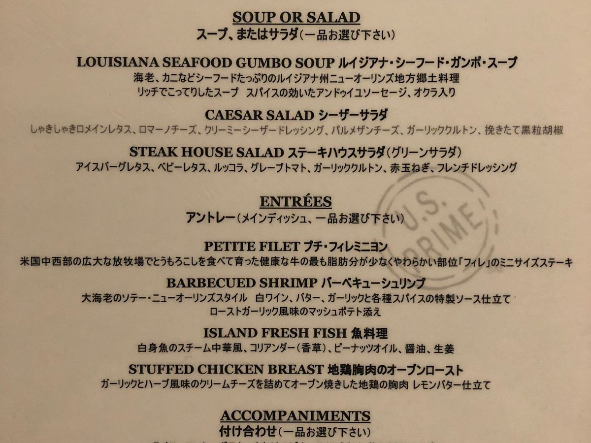 ディナーのお食事は、某ディナークルーズのロブスターより小振りでしたが、苦味がなく美味しかったですお肉にかかっていたソースは甘めでしたので、塩辛いものがお好きな人には物足りないかもしれません。"ソルトプリーズ"と頼んで塩を持って来てもらっていた方もいました。