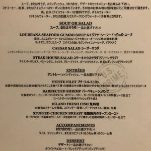 お料理はコース。ロブスターとお肉と魚も食べられます。お値段もそれなりにするので、味は値段相応かな?ウェルカムドリンク以外にもう1杯飲み物を頂けるのですが、アメリカンサイズなので、私達は追加で飲み物を注文することはありませんでした。飲み物を追加すると別途料金が発生するようです。