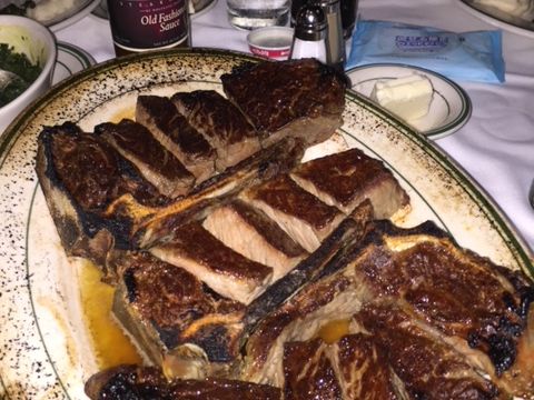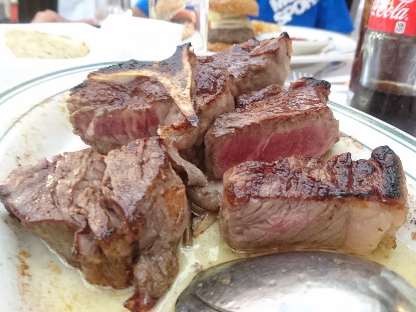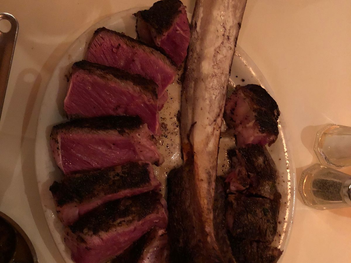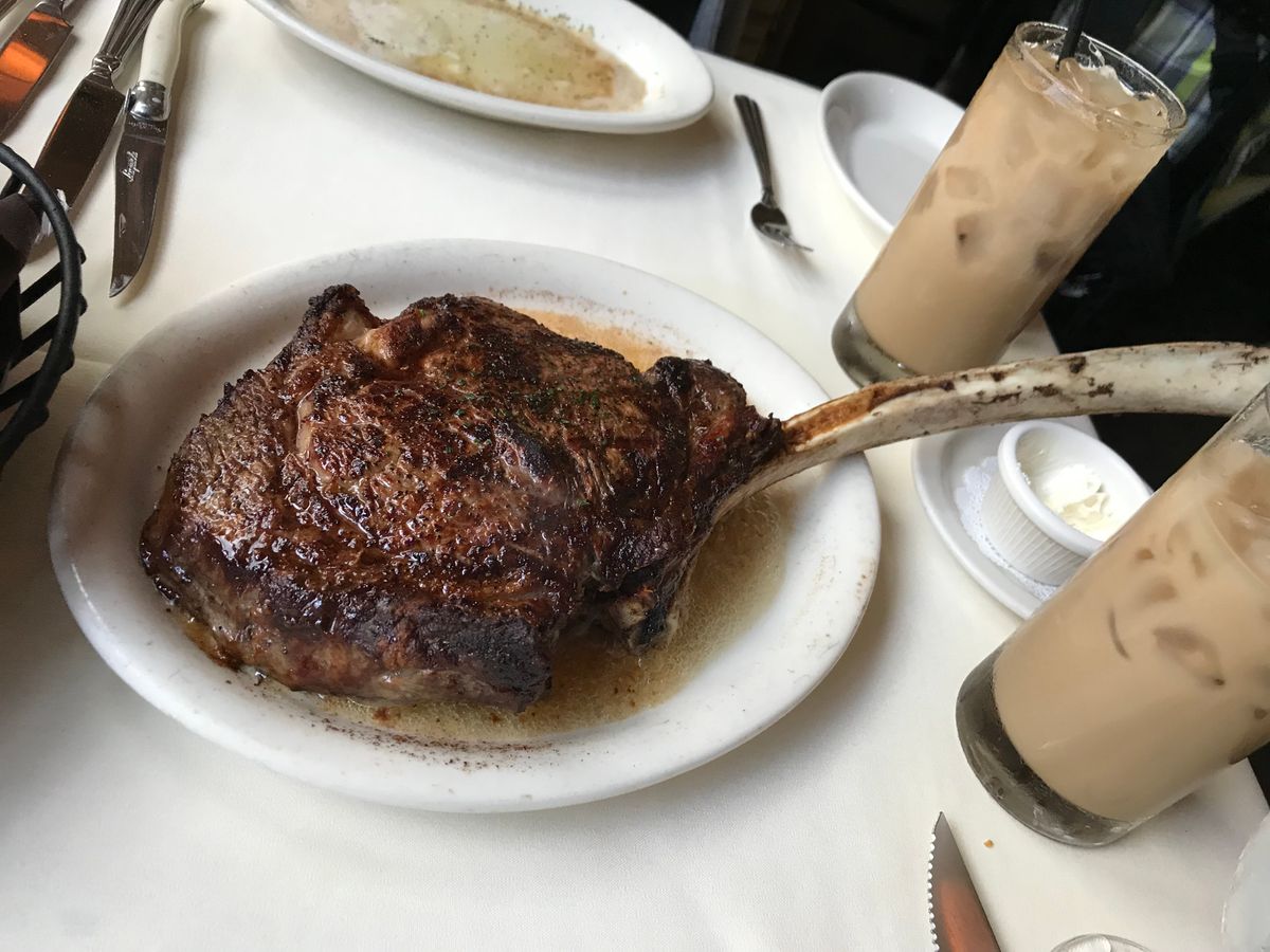席について楽しみに待っていると、テーブルに運ばれてきたその骨つきの大きな肉を見た瞬間、その脂ぎった迫力のある豪快なインパクトにはびっくりしたのを覚えています。