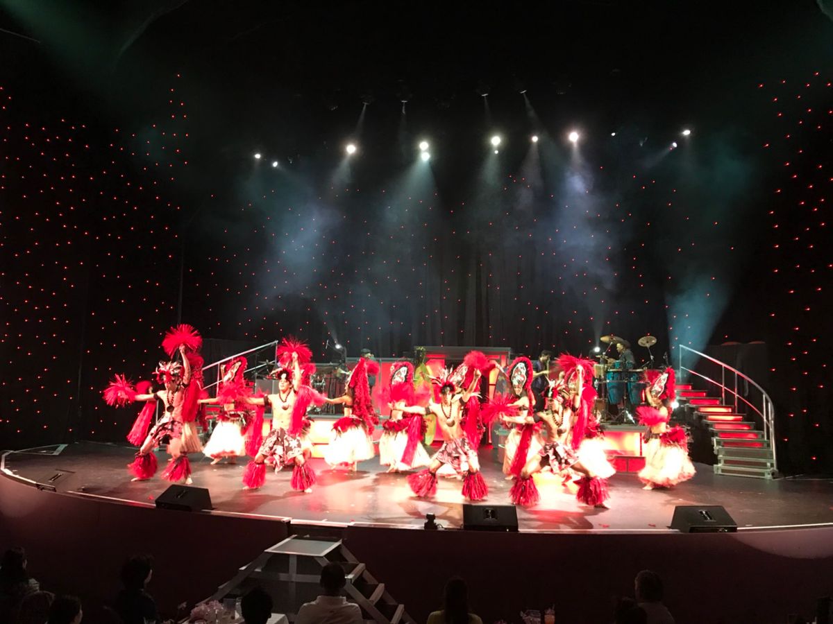 現地に到着すると、まず、ウェルカムドリンクがあり、ビュッフェを食べました。ショーは、フラダンスよりも、モノマネショーが面白かったです。