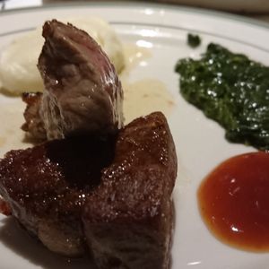 お肉用のソースよりもマッシュポテトとほうれん草付けて食べた方が、より美味しい!