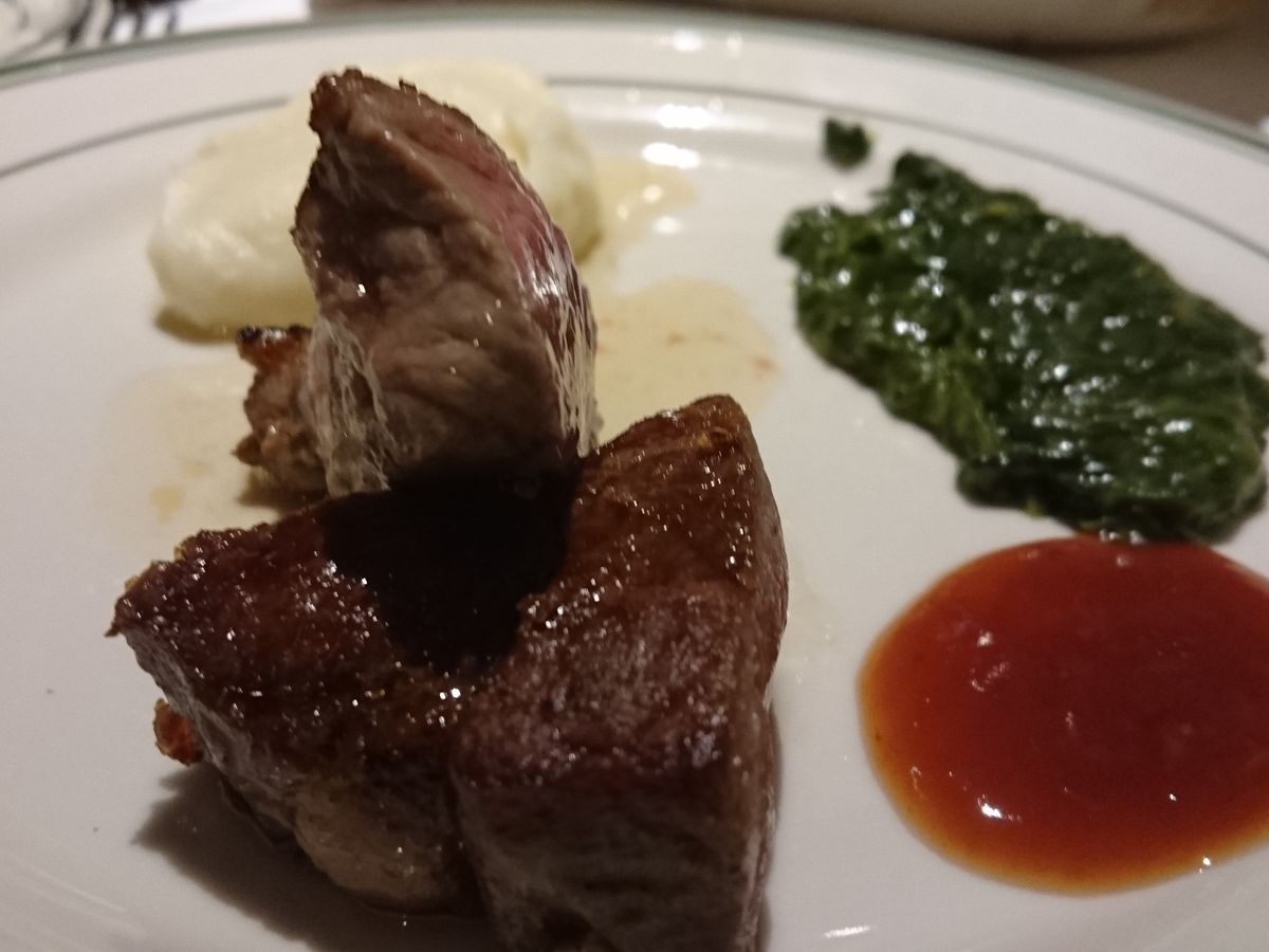 日本のステーキ店で食べる「ヒレ」よりもさらに赤身が凝縮されたような肉はとてもおいしく、特に骨ぎわのちょっと焦げた辺りが最高でした。そのままかじりつきたかったのですが、マナー的にNGのようです。付け合わせもデザートのシャーベットも美味しかったです。