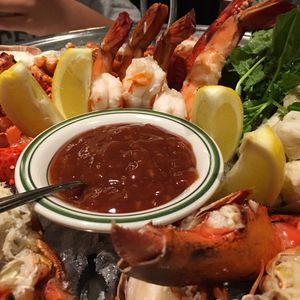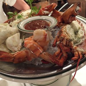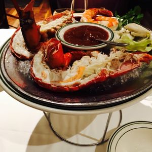 わくわくしながらお店に入りました。最初にえび、オマールエビ、カニが氷り付きで綺麗に盛り付けされて出てきました。ぷりぷりで美味しかったです。其の後Tボーンステーキが来てウエイターの方が切って盛り付けて下さいました。最高級熟成肉とても美味しかったです。デザートは生クリームケーキなど3種ついていました。ウエイターの皆様、笑顔でとても感じが良かったです。主人と私とても満足しました。