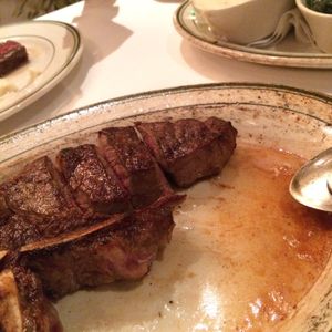 まず出てきた大量のクラッカーに驚きました。当然完食できるはずもなく手持ち無沙汰に待っていると、ようやく海鮮の盛り合わせが…。私は苦手なため、一人で食べてくれた彼女によると「大変美味しかった」とのこと。メインのTボーンステーキでやっと私の出番です。ただ、3年前に同じくここで頂いた時に比べて、皿に溜まった油の「ジュージュー」という音が控えめな気がして、実際に猫舌の私がすぐにかぶりつけたぐらいですから、少し冷めていたと思われます。