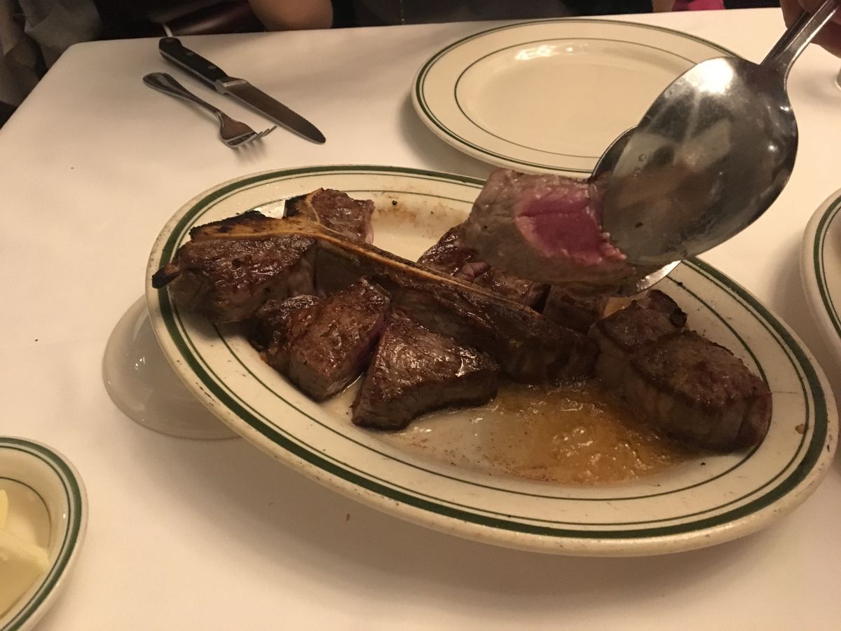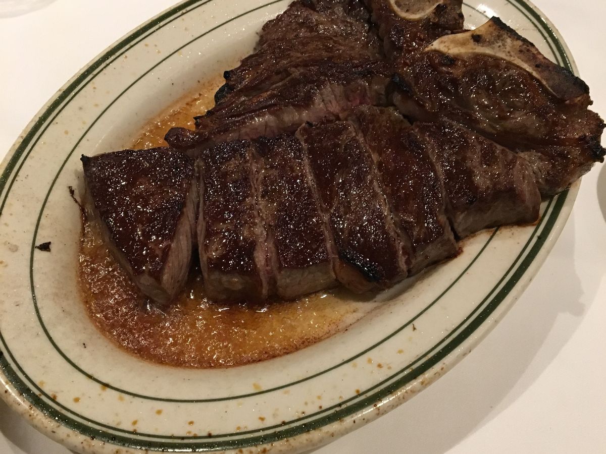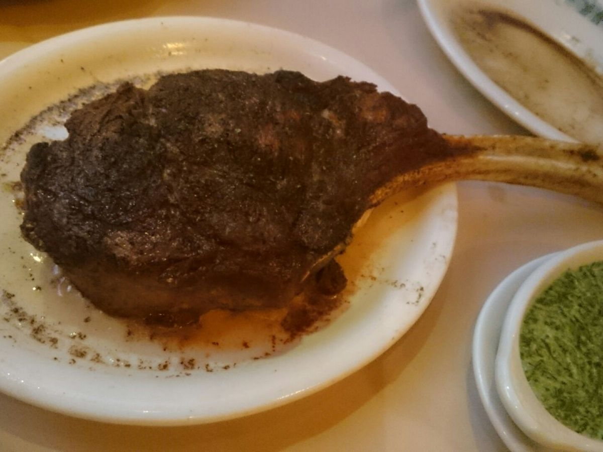 まず出てきた大量のクラッカーに驚きました。当然完食できるはずもなく手持ち無沙汰に待っていると、ようやく海鮮の盛り合わせが…。私は苦手なため、一人で食べてくれた彼女によると「大変美味しかった」とのこと。メインのTボーンステーキでやっと私の出番です。ただ、3年前に同じくここで頂いた時に比べて、皿に溜まった油の「ジュージュー」という音が控えめな気がして、実際に猫舌の私がすぐにかぶりつけたぐらいですから、少し冷めていたと思われます。