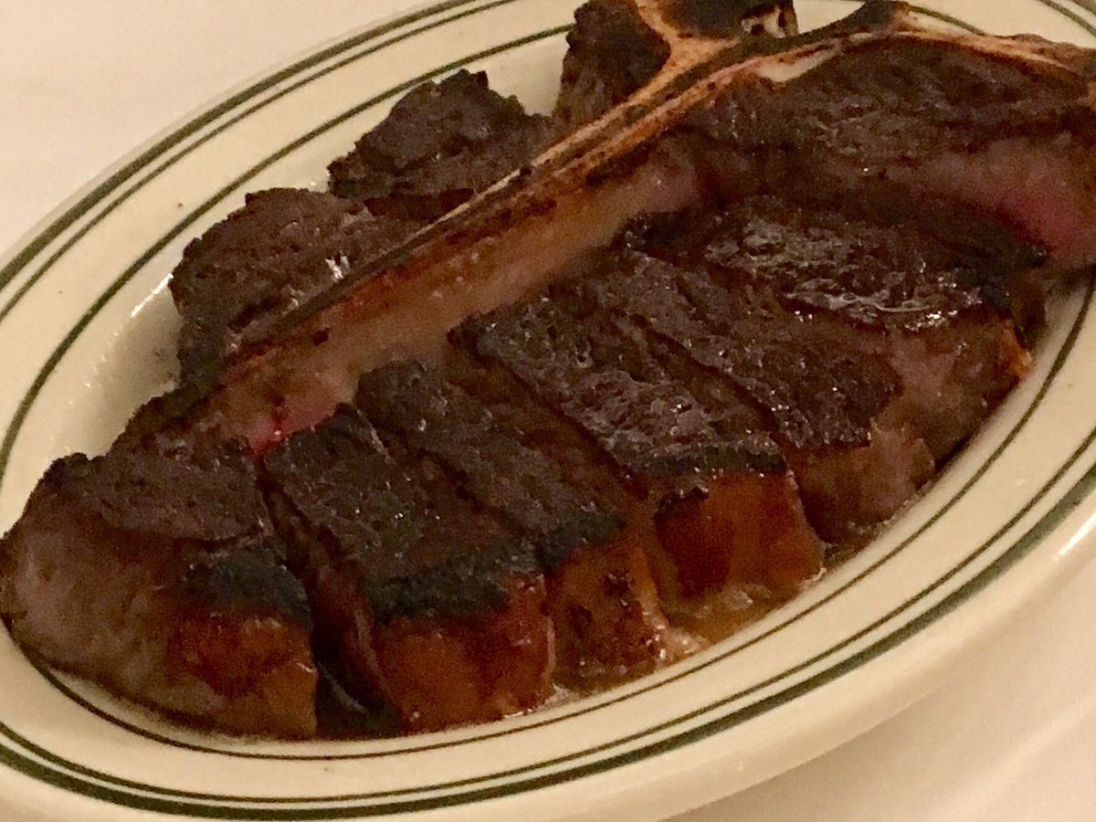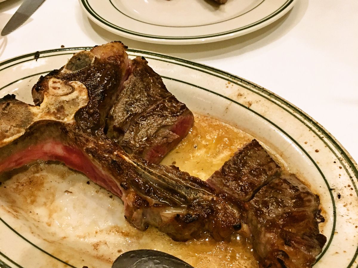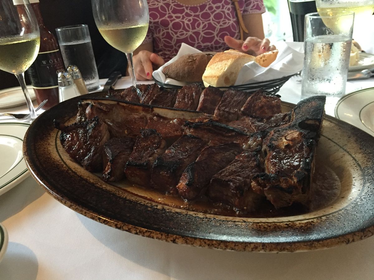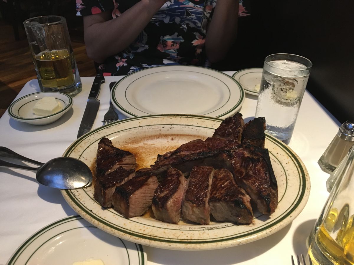 まず出てきた大量のクラッカーに驚きました。当然完食できるはずもなく手持ち無沙汰に待っていると、ようやく海鮮の盛り合わせが…。私は苦手なため、一人で食べてくれた彼女によると「大変美味しかった」とのこと。メインのTボーンステーキでやっと私の出番です。ただ、3年前に同じくここで頂いた時に比べて、皿に溜まった油の「ジュージュー」という音が控えめな気がして、実際に猫舌の私がすぐにかぶりつけたぐらいですから、少し冷めていたと思われます。