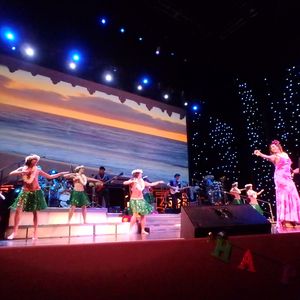 そして、ホラ貝の音で古典のフラが始まりました。ステージ両脇のスクリーンも火山や宇宙の映像。曲の転調とともにエルビス・プレスリーがカヌーに乗って登場しました。フラは、「フラ風のダンス」といった感じで、割合的に少なくエンターテイメントに特化されているようでした。