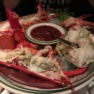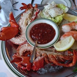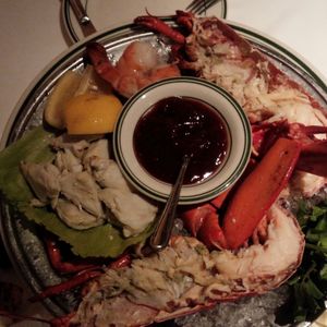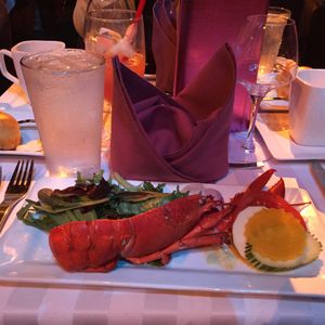 ロブスターにステーキ、サーモン、マッシュポテト、デザート、ドリンクです。