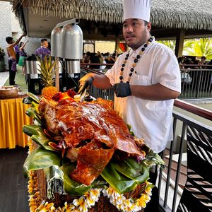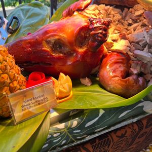 受付でチェックインを済ませると席に通され、すでにパイナップルが用意されていました。程なくしてマイタイカクテル(ソフトドリンク)が提供されます。ビュッフェの準備が整ったらビュッフェコーナーで食べたいものを取りました。食事の合間には、ハワイの音楽を堪能したり、フラダンスの体験もできます。
