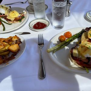 コーヒー、厚手のベーコンが入ったエッグベネディクトに私はサラダ、妻はベイクドポテトを注文。