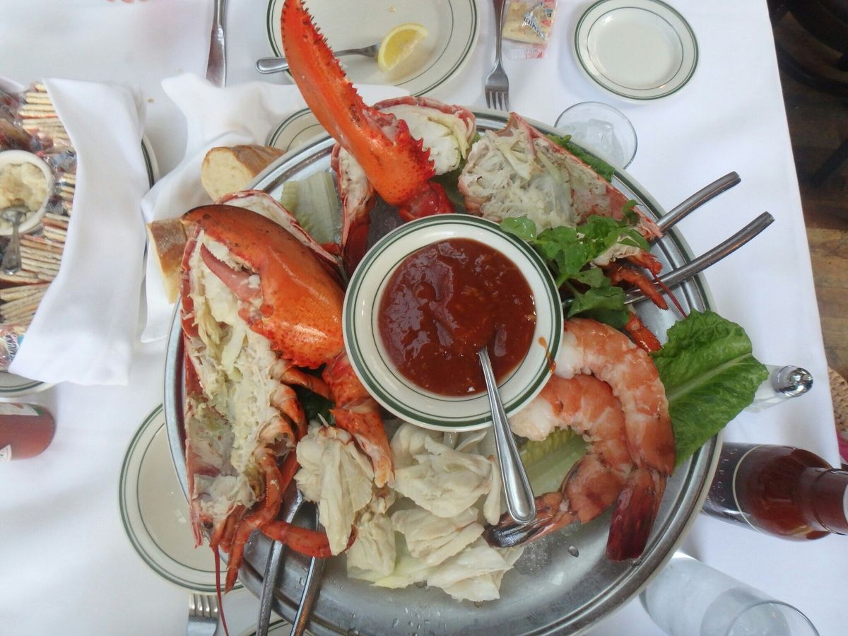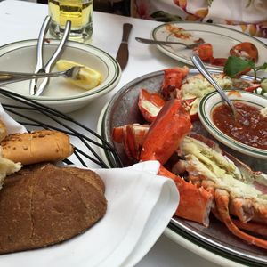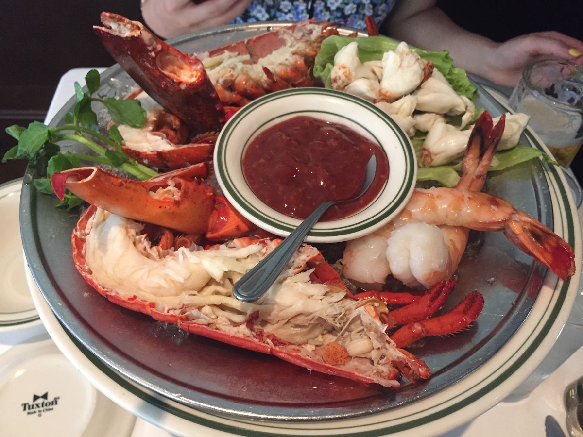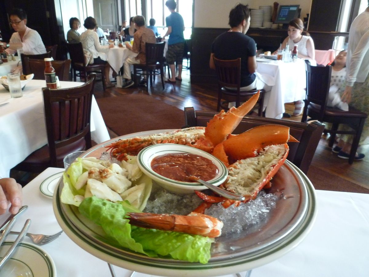 予約がいっぱい。満席でした。日本で予約して正解。エビが最高、カニはやたら美味い。肉はTボーンで左右片方づつで1枚で2人前。味は赤みだから普通。ソースがカゴメソースとケチャップを足した感じ。塩、コショウの方がいいかも。