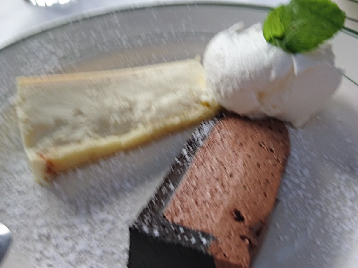デザートはチーズケーキとオレオ生地のチョコケーキ。どちらも1つを半分にした薄さで提供され、どこかのグループと半分こなんだなと思いました。量的にはちょうど良かったですが。