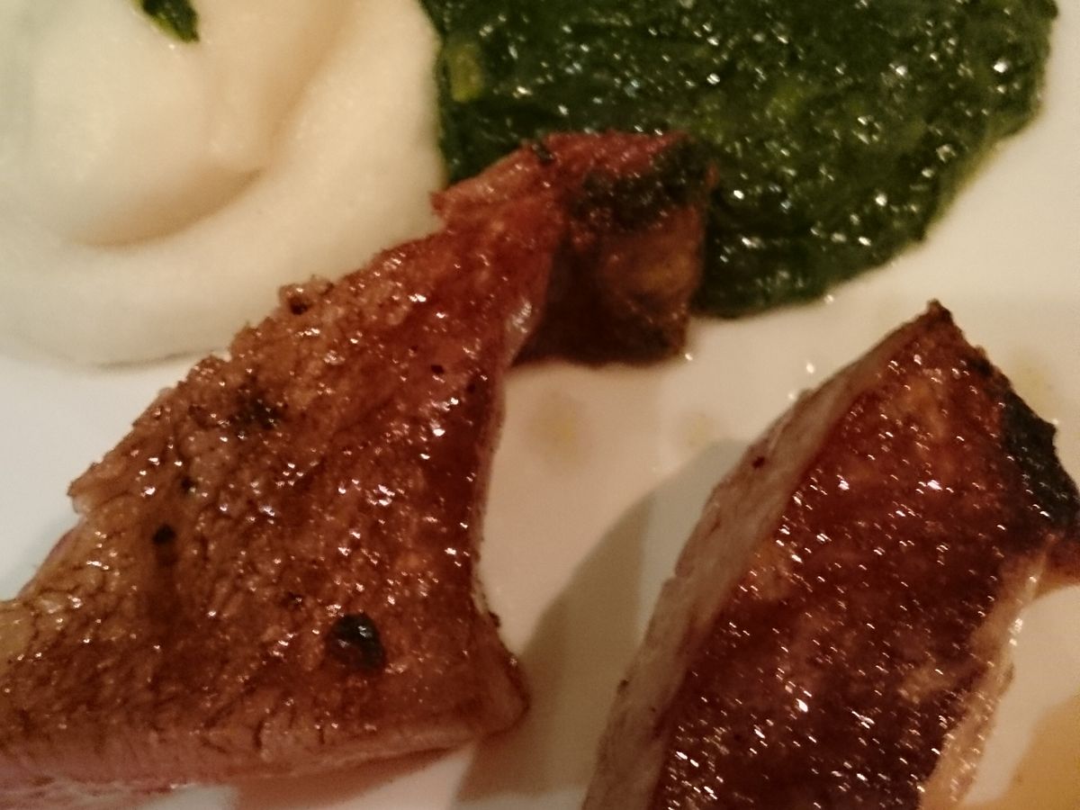 名前入りのメニューカードが用意されていました。メニューカードは準備されているレストランが多い中、名前の印刷されたカードには関心しました。前菜・サラダ.メイン・デザートと進行していきますが、すべて美味しいと思います。ただ、一品の量が半端ではないので・・・無理をしない程度に召し上がることをお薦めいたします。私も大食の部類に属しますが、メインは食べきれませんでした。家内がカモ、娘がサーモン(付け合わせに3品つきます)、私はリブステーキを選択しました。コンビーフに近い柔らかさで美味しいのですが、日本の3倍つまり3人分はあると思います。特にドレスコードにこだわりはないようですが、スマートカジュアルでの来店