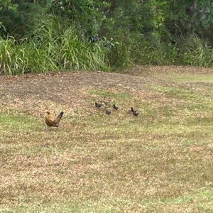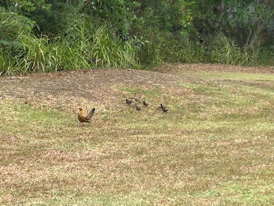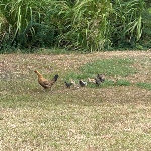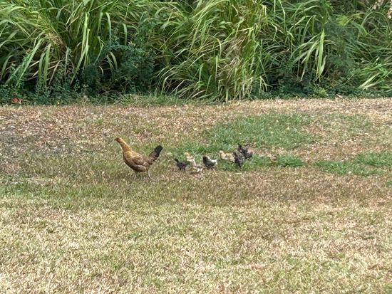 ニワトリの親子さん、放し飼いの犬さん、