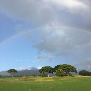 こちらのコースは2回目です。ゴルフが、そこまで上手くない私でも、なんとかなるフラットなコースです。遠くにダイヤモンドヘッドが見えて、虹も見れました。