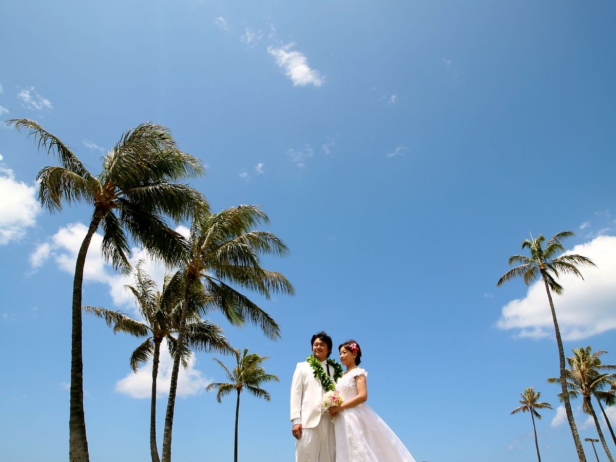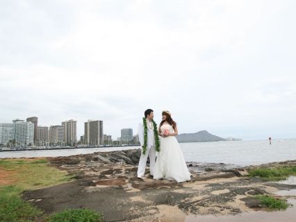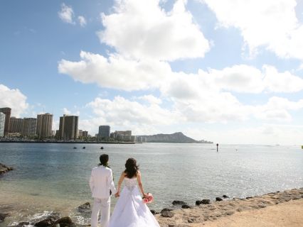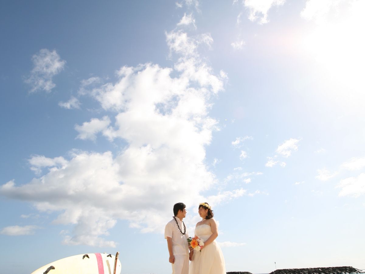 初めてのハワイ、初めてのウェディングドレス。女性にとっては子供の頃からの夢ですよね。そんな中、お気に召して頂けるドレスがあり、プランにもご満足いただけたとのこと、私どもも非常に嬉しい限りです。お泊りのホテルでもきっと素敵な写真がとれたのではないでしょうか。この度は誠にありがとうございました。そして末永くお幸せに!