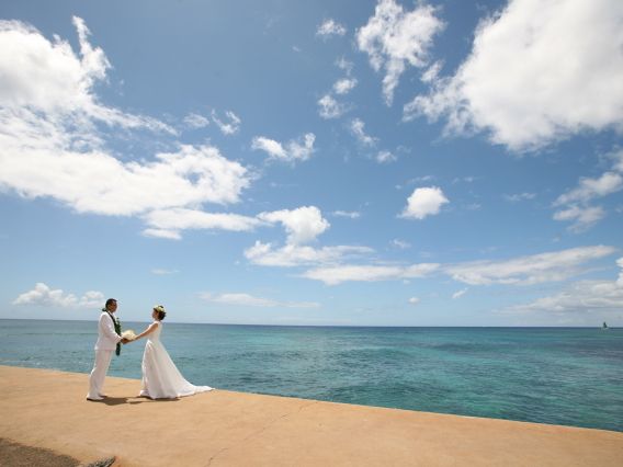ハネムーンの思い出に、ハワイのビーチと思ったらこのプランはお得なのでおすすめです。プランで選べる衣装は男女ともに2着だけ(男性は黒か白、女性はパニエを使わないタイプのシンプルなデザインのドレス2種)、小物もプラン内では1種類しかありません。ですが、差額料金をプラスすれば、衣装は300種類、小物も色々あるそうですし、持参すれば何でも使えるようです(持ち込み料金なし)。私達は全てプラン内のものでお願いしましたが、それでも一通り全部そろい、満足しました。
