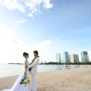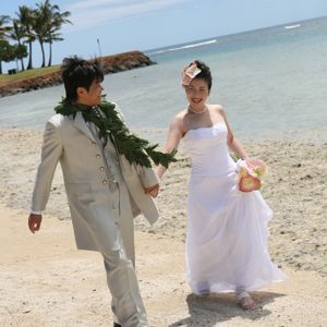 日本で挙式・披露宴を行いましたが、今回ハネムーンのオプショナルを探しているとき“メモリアルビーチフォト”を見つけて、『これだ!!』と迷わず申し込みました。以前ハワイに行ったとき、ドレス&タキシードでビーチを歩いてる新郎・新婦を見てずっと憧れていたので…