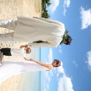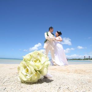 当日はあいにくやや曇り空だったけビーチはとても綺麗で夢のような体験をした感じです。あまりの眩しさに眼がなかなか開かなくてカメラマンさんには苦労をかけてしまったんですがとてもいい写真がホテルに送られてきたのでよかったです。帰国後のまわりの反響もよかったですよ(^^)