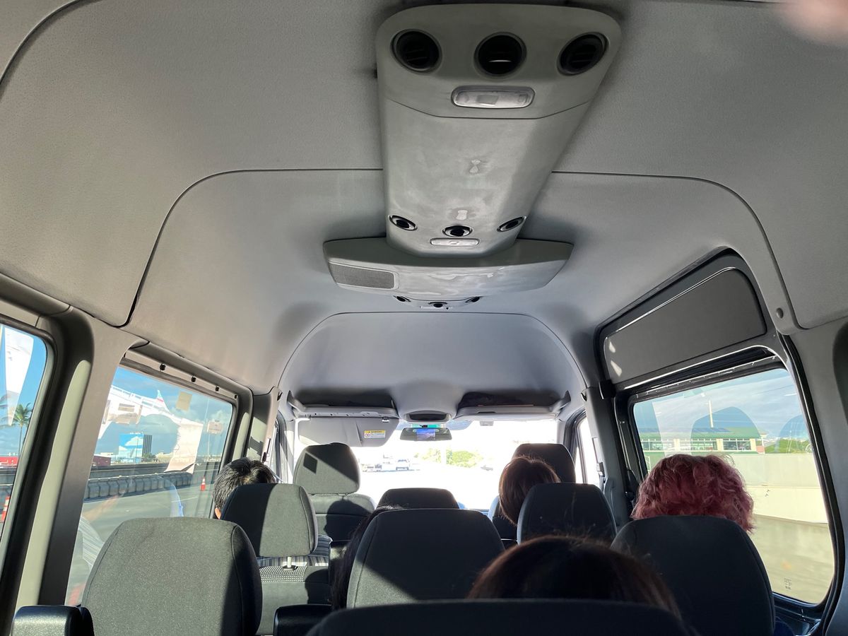 空港からは30分おきにシャトルが出ているので、団体専用出口から出て、カウンターで名前を伝えたら5分後には乗車、そのあとすぐに出発しました。今回乗車したシャトルは写真の12人乗り?の一般的なバンでしたが、車内は綺麗で空調も効きすぎず、ちょうど良かったです。