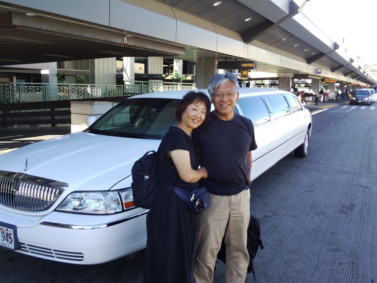 ホテルのロビーで待っていると、名前を呼ばれて荷物を持って運転手の方について行くと、ホテルの前にリムジンが停まっていました。観光地でリムジンが走っているのは見かけましたが、乗るのは初めてでした。ホテルからの乗車は、6人でした。途中追加乗車無しで空港まで送って貰いました。航空会社のチェックロビー毎に降ろしてくれて、私達二人が最後でした。リムジンから降りて、荷物を降ろしてくれている間に車の写真を撮っていると、運転手の方が車をバックに写真を撮ってくれました。ハワイ旅行の最後にとても良い記念になりました。