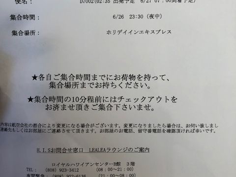 7時過ぎのフライトより随分早い、朝5時15分のピックアップの指定。これでは朝食も無理、かつ四時半起き。所が5時にフロントから車が来てるとの連絡。慌ててチェックアウト。混載の為か、他のホテルから乗られて来た方が既にバスに乗っておられました。そちらのスケジュールに併せられてかなり早く成ったのか?空港へは支障なく到着。降りると荷物渡されそれで終わり。前回はチェックイン手続きまでの親切なアシストなどが有りましたので、サービス低下にはガッカリ。自助努力で対象出来ますが、サービスは一定に保って欲しいものです。早く着きすぎたため、フライトは1便早いのに変更。遅れるよりは良いですが、これなら、一時間後のピックアップで良かったはずでした。運行する便を減らしたかったのか、混載便の宿命なのか、ガッカリでした。
