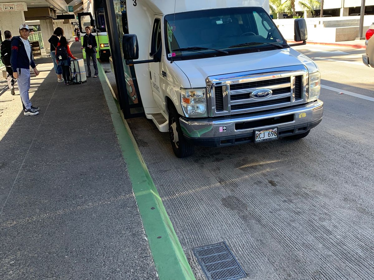 空港の長い行列のイミグレーションを抜け、空港の外もまたすごい混雑でしたが、なんとかデスクにたどり着き、そこからはスムーズに事が進みました。2階のシャトルデスクでナンバーを受け取り、番号が呼ばれシャトルバスに乗り、快適な運転でホノルル市内へ。宿泊予定のホテルは小さな宿舎でしたので、近くの大きなホテル前で降りました。それもドライバーさんが説明してくれ、親切でした。トランクを持っての一人旅はシャトルが一番と思います。