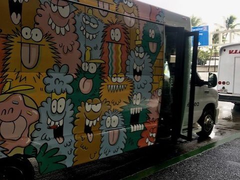 ホテル→空港プランを二度目の利用です。時間通りにホテル前まで来てくれて、スーツケースの積み込みもドライバーの方がやってくれます。今回は人数が多かったせいか、カカアコウォールアート塗装の大きめの車でした。空港では航空会社ごとに降ろしてくれるので、カウンターまですぐで助かります。