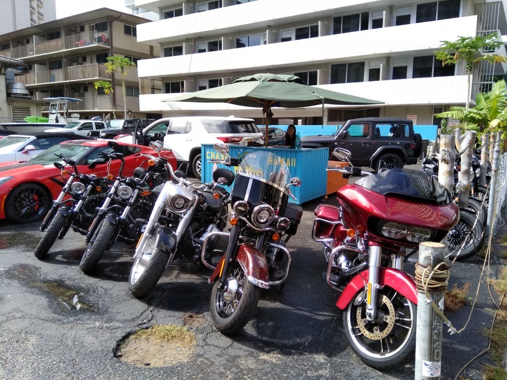ホテルのすぐワイキキ側にはレンタカー屋さんがありました。いろんな車だけじゃなく大きなオートバイもレンタルできるようです。日本の免許証だけで借りられるとかワイキキではヘルメットが不要とか、すごく気持ちがそそられました。帰りのシャトルには「マラソンだけじゃなくまたハワイに遊びにきてオアフ島一周ツーリングでもしてみようか」と思い返している私がいました。
