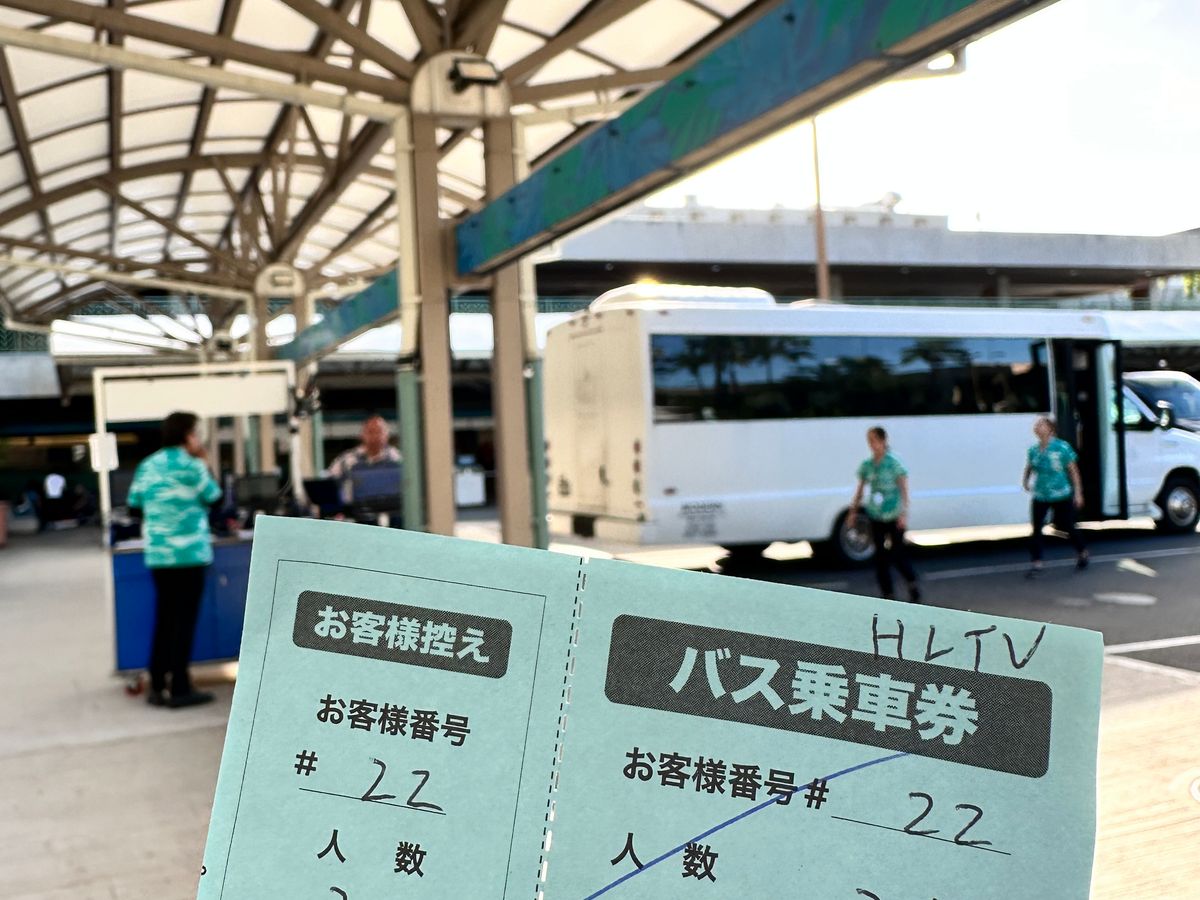 ホノルル空港の団体出口を出てすぐ受付カウンターがあります。以前はエスカレーターを上がって…と案内されていましたが、今回は受付のすぐ後ろからシャトルに乗れて楽でした。色のついた受付カードを渡され、呼ばれるまで待ちます。