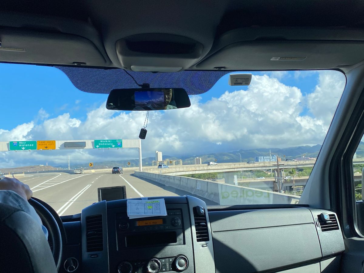 ラッシュの時間ですし、乗り合いなので仕方ないのですが、最初にピックアップされてからワイキキのホテルをぐるぐる回り、H1へ。