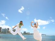 ハネムーンの思い出に、ハワイのビーチと思ったらこのプランはお得なのでおすすめです。プランで選べる衣装は男女ともに2着だけ(男性は黒か白、女性はパニエを使わないタイプのシンプルなデザインのドレス2種)、小物もプラン内では1種類しかありません。ですが、差額料金をプラスすれば、衣装は300種類、小物も色々あるそうですし、持参すれば何でも使えるようです(持ち込み料金なし)。私達は全てプラン内のものでお願いしましたが、それでも一通り全部そろい、満足しました。