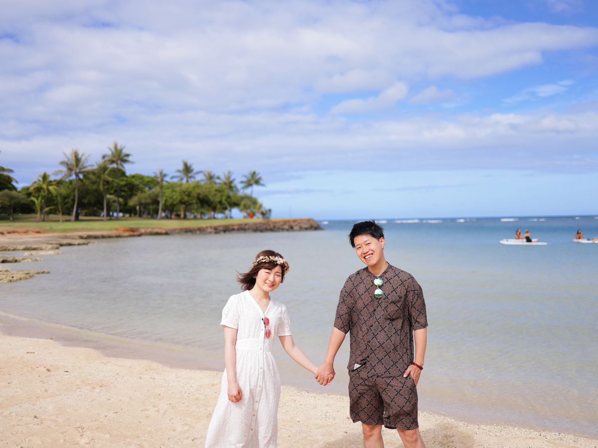 新婚旅行でハワイに訪れました。ウェディングドレスを着たウェディングフォトというより、アロハシャツやムームーで少しカジュアルな雰囲気での写真を希望していたところ、ご縁があり利用させて頂きました。