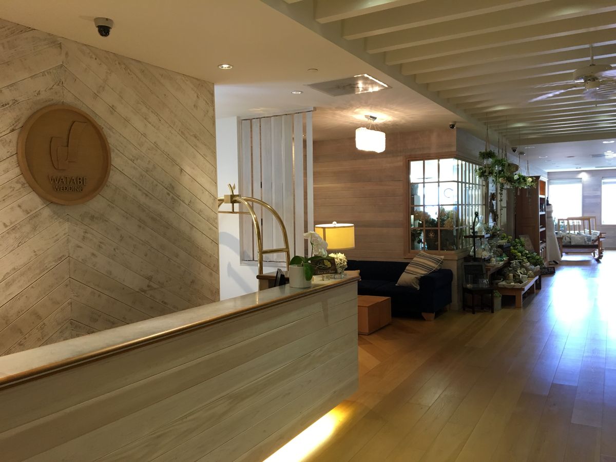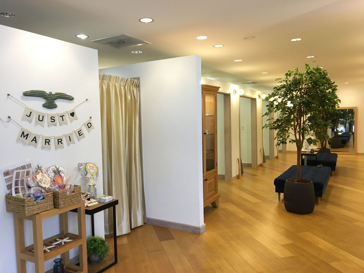 撮影当日、ホテルの車寄せにお迎えの車が来ます。催行会社(Saison Des Brides for Watabe)から歩いてすぐ(ワイキキビジネスプラザ9階)でしたが、お迎えありでした。エレベーターを降りたらワンフロアでしょうかWatabeさんのとてもかわいいオフィスです。早速ドレス選びから。私たちは追加しないでなんとか…と思っていたのですが、新郎は追加なしだと黒のタキシード2種類程しか無い為追加し私の衣装も800ドル以内だと好みでないデザインばかりだったので結局選び放題の追加してしまいました。(一生に一度だと思って…)