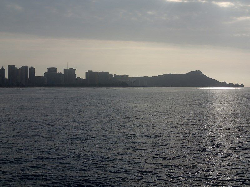 出航後、ワイキキのホテル群を海上から見ることができ、ワクワク感がさらに増し、朝焼けの中、逆光のダイヤモンドヘッドにも大満足。すると、目前にトビウオがぴゅーんと。船内は歓声が沸く。乗船後、約15分後”OVER THERE”指さす方向を見ると、いました。くじら君たち。説明によると親子2頭、この時期は、子育てのため温かいハワイにやってきて、その後アラスカやカナダ方面に移動するという。カメラを構えて、潮吹きのシーンを撮ると何度目かにしっぽをパチンとする。しっぽパチンからは、深く潜ってしまい、5分以上何も起こらない。移動してしまうのだ。