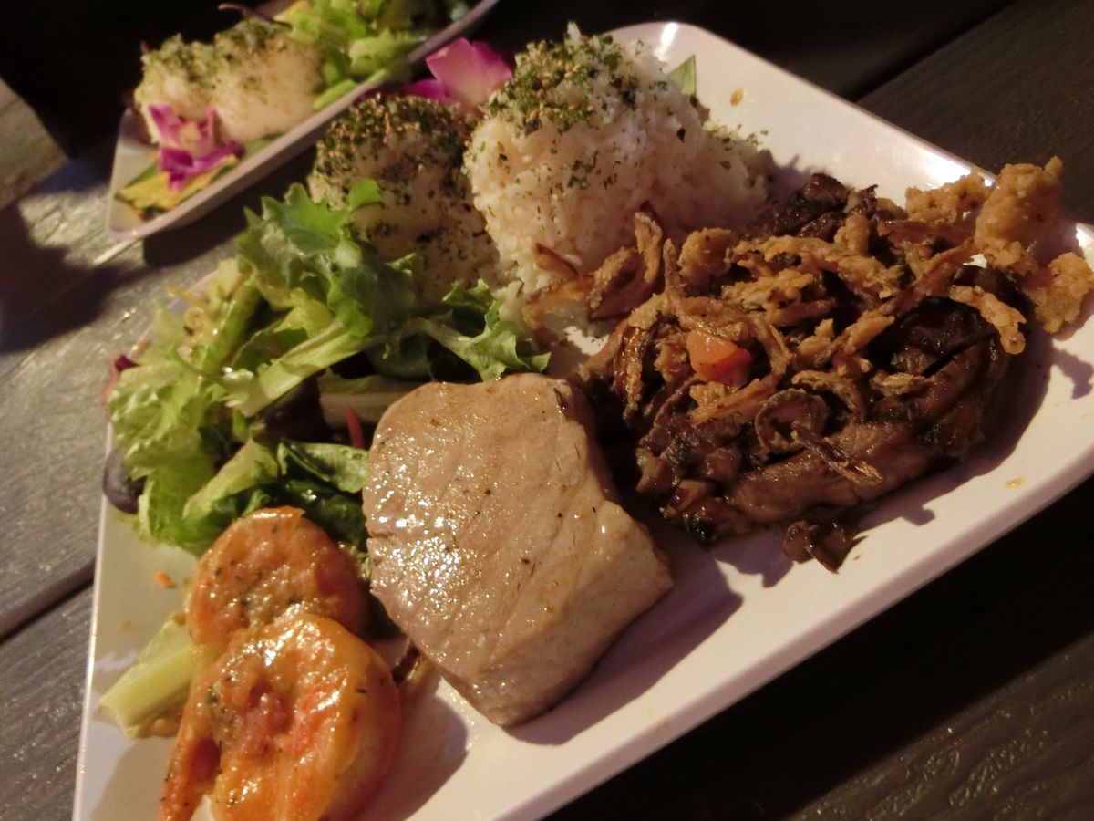 夕方、ホテル前ピックアップで、まずは、クィーンズビーチのベアフットカフェで夕食。ガイドは穴場HAWAIIのJodyさん。ちょうどサンセットの時間で、ムーディな演奏を聴きながら食事をすることができました。プレートディナーはツアーオリジナルとのことで、ビーフ・ツナ・シュリンプのどれも美味しかったです。時間もゆったり取られており、ワイキキビーチの夕焼けから夜景までをじっくり楽しむことができました。